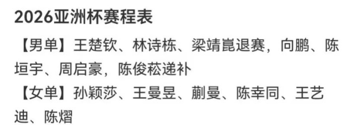 这次的参赛名单中显示,梁靖崑退赛,陈俊松递补。女单中有孙颖莎、王曼昱、蒯曼等人出赛。这次比赛明显是内战,不知道王楚钦和孙颖莎会不会拿下新年第一冠。